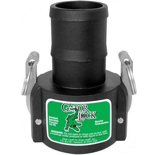 Gator Lock Female Coupler Hose Shank are polypropylene couplings with EPDM gaskets. The exclusive Cam Lever Locking Mechanism helps to reduce the possibility of unintentionally opening the cam levers, which could result in personal injury and costly spills. These cam-level couplings have a smooth sealing surface.