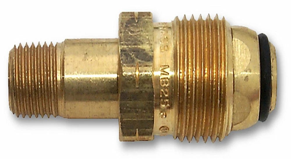 A Flame Engineering Inc Excess Flow soft-nose P.O.L. connector incorporating an excess flow safety device. Outlet fitting is 1/4" MPT (Male Pipe Thread). Flow rate is 1.8 gallons per minute.