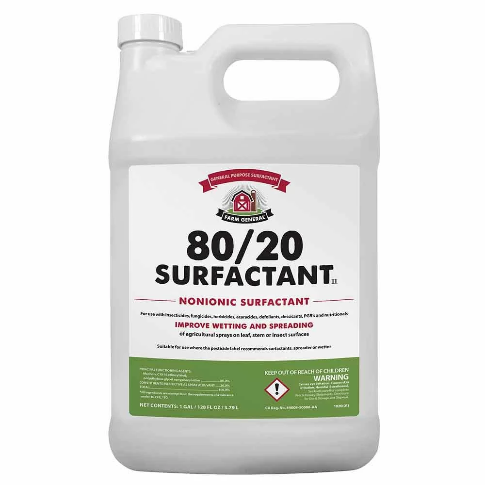 Farm General 80/20 Surfactant is a general purpose non-ionic surfactant of the alcohol ethoxylate, alkylphenol ethoxylate type surface active agents. It can be used with most insecticides, fungicides, herbicides, acaricides, defoliants, desiccants and wettable powders to improve performance of the active spray ingredient by giving them more uniform distribution and better wetting of the plant surface.