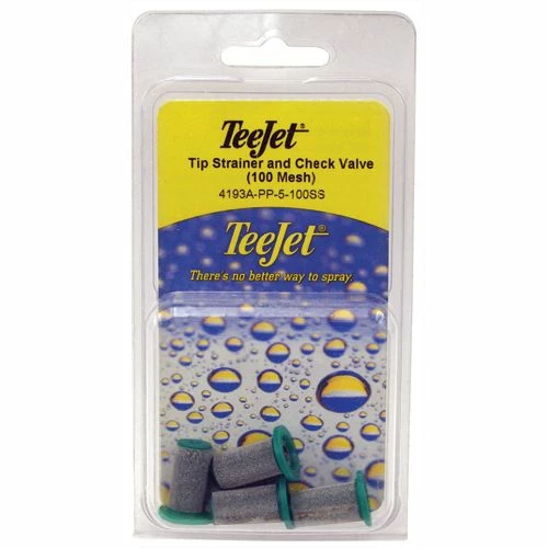 TeeJet® Steel Tip Strainer with Check – 4 Pk. minimizes nozzle dripping. The ball check opens at 5 PSI. They are recomended for flow rates up to 0.8 gpm (3 l/min.). Note: Use of these ball check valves results in a pressure drop of 5 PSI (0.34 bar) to 10 PSI (0.7 bar) depending on spring rating. Not for use with AI or DG tips.