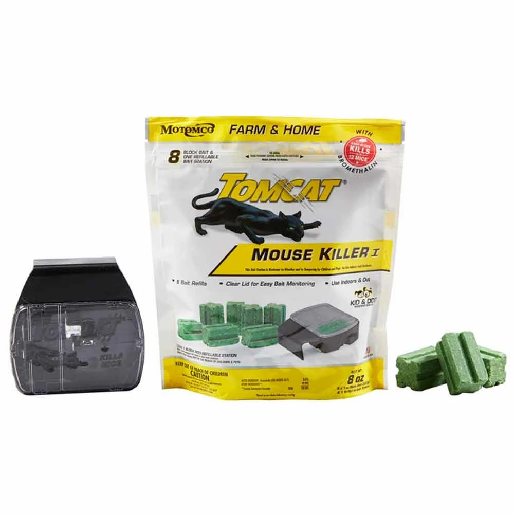Tomcat Mouse Killer I Kid and Dog Resistant Refillable Station with Bait Refills contains one Tier 1 Refillable Bait Station and 8 x 1oz of Block Bait Refills. Effectively controls mice while providing the security of a Tier 1 child and dog resistant station. The station has a clear lid for easy bait monitoring. All Tomcat consumer size baits are made with Bromethalin – an acute, non-anticoagulant active proven to kill mice faster than anticoagulant baits. Each Block kills up to 12 Mice, based on no-choice laboratory testing.